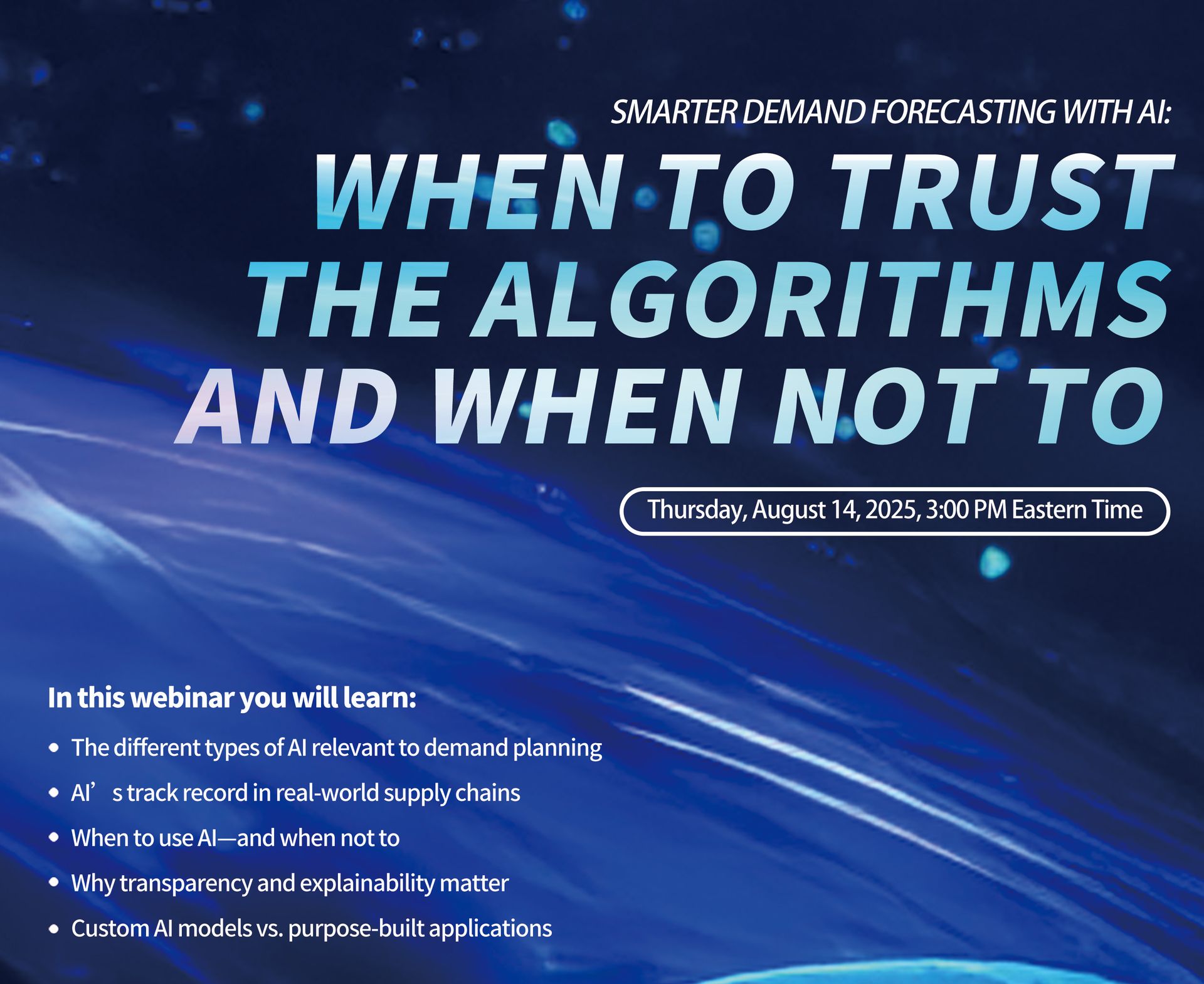Join us for a dynamic session exploring how AI and machine learning are reshaping demand planning. Today’s planners face increasing uncertainty and volatility, driven by shifting tariff policies, supply shocks, and other disruptions. Discover how advanced forecasting models can boost demand visibility—and when traditional statistical techniques may still be your best bet.
